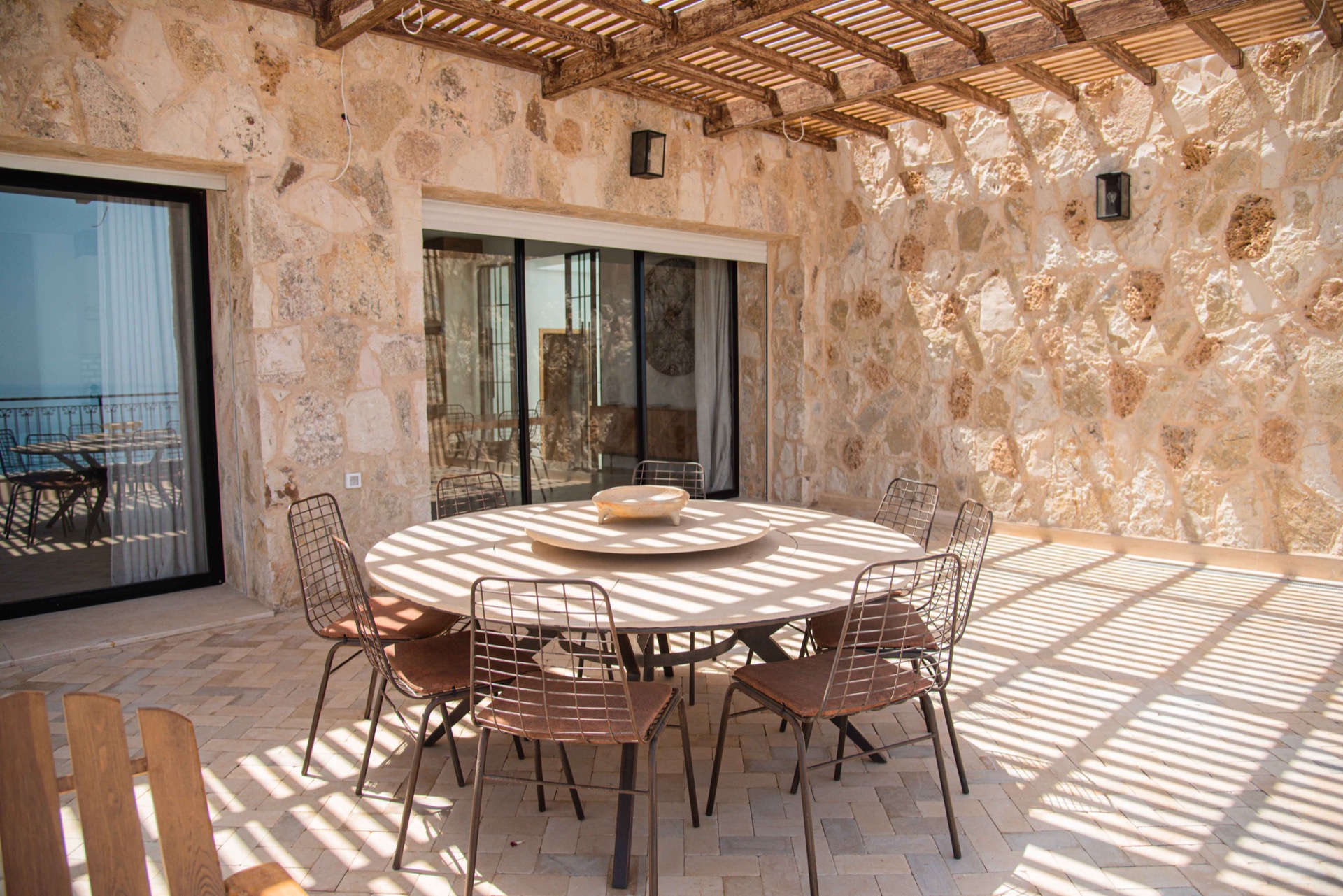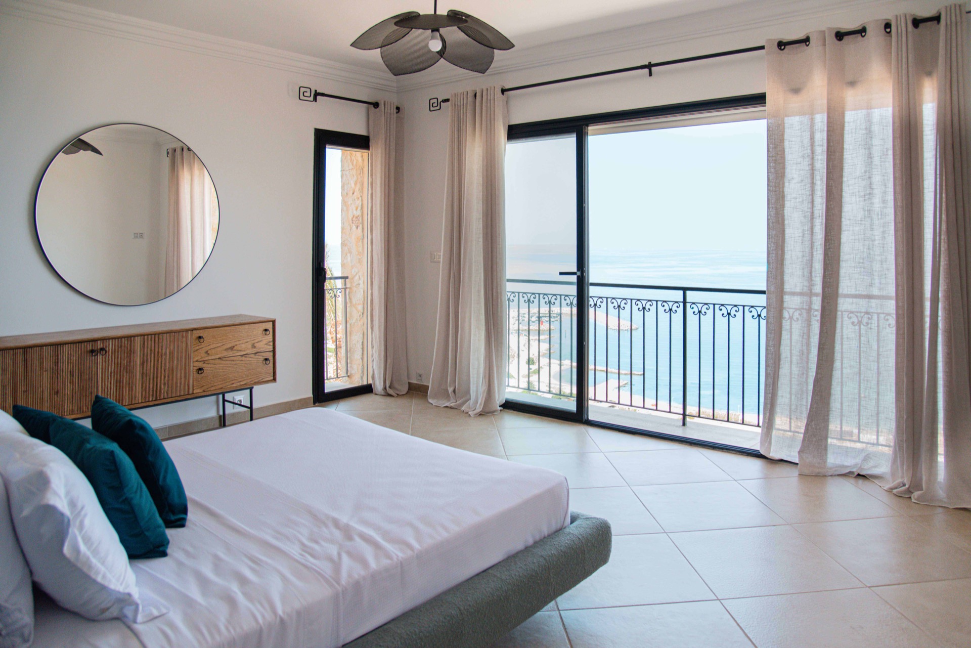 DAR JULIA Cette villa luxueuse allie élégance méditerranéenne et design moderne, offrant des aménagements exceptionnels à l'intérieur comme à l'extérieur. Extérieur À l'extérieur, une piscine à débordement surplombe une vue imprenable sur la mer, entourée de palmiers et de terrasses en pierre naturelle. Cet espace est idéal pour se détendre et profiter de la beauté naturelle environnante. Intérieur À l'intérieur, une cuisine ouverte avec des finitions haut de gamme et un bar en bois massif invite à la convivialité. La salle à manger spacieuse, baignée de lumière naturelle grâce à de grandes baies vitrées, offre une vue magnifique sur l'extérieur. Salon Dans l'espace ouvert de la maison, le salon est un havre de confort et de style. Aménagé avec des meubles modernes et élégants, il est idéal pour se détendre ou recevoir des invités. Les grandes fenêtres et les portes vitrées laissent entrer une abondante lumière naturelle et offrent des vues imprenables sur la piscine et la mer. Suites Les suites de la villa sont de véritables oasis de confort et de tranquillité, offrant chacune une vue spectaculaire sur la mer. Décorées avec goût, elles allient des matériaux naturels et des touches modernes. Les grandes fenêtres panoramiques laissent entrer une abondante lumière naturelle et offrent des vues imprenables sur les paysages environnants. Les suites disposent de lits doubles de salles de bains attenantes luxueuses avec des douches à l'italienne. Des espaces de rangement généreux et des touches de décoration élégantes complètent ces havres de paix, assurant un séjour des plus confortables. Hammam Pour une détente ultime, la villa comprend également un hammam privé. Cet espace de bien-être, décoré dans un style traditionnel avec des mosaïques et des matériaux naturels, offre un lieu parfait pour se relaxer et se revitaliser après une journée au soleil.